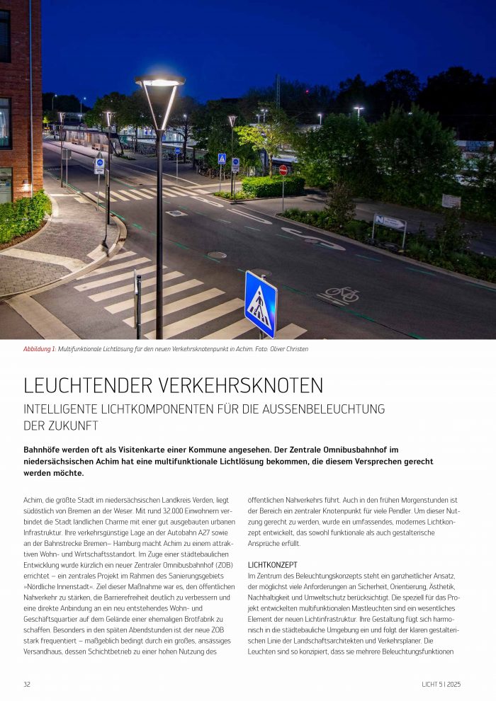 Am neuen ZOB in Achim wurde 2024 die O-Space-Leuchte installiert. Sie bietet adaptive Lichtsteuerung, reduziert Lichtverschmutzung und ist umweltfreundlich – ideal für Städte und Parks.